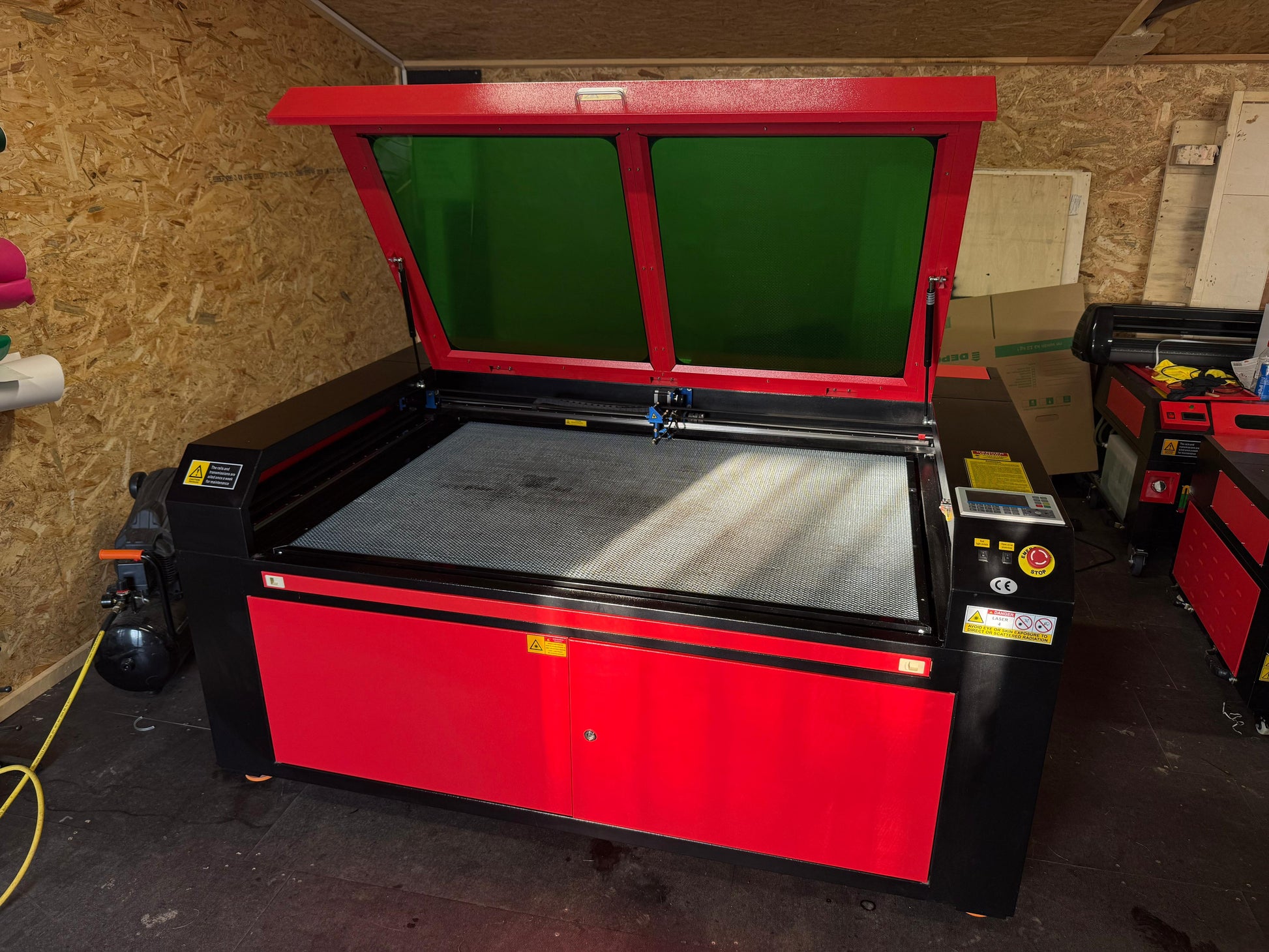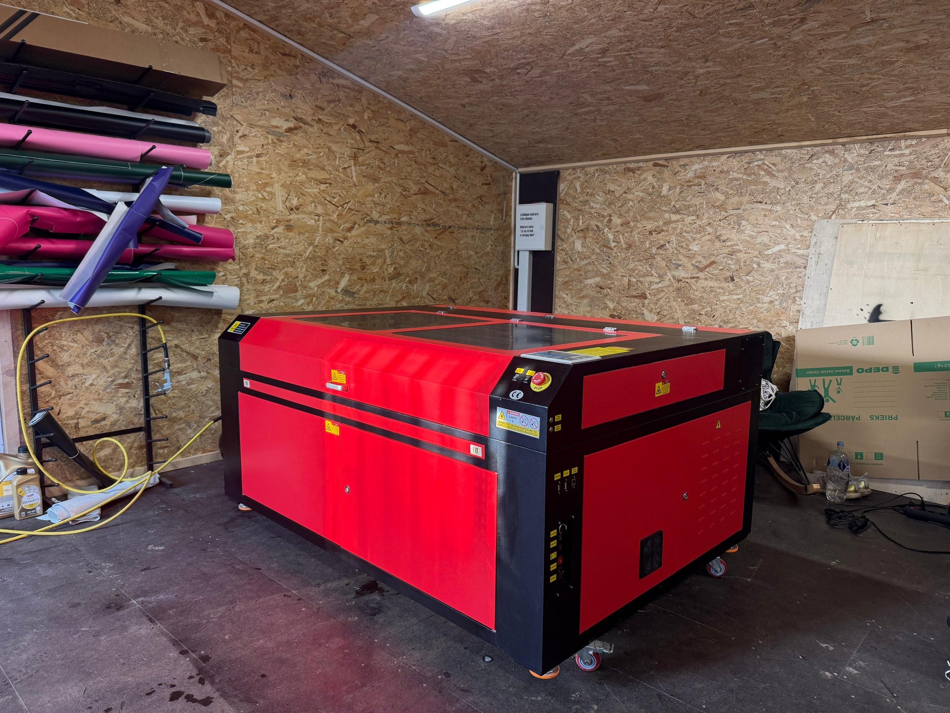 Mazlietota CO2 tipa lāzergriešanas un gravēšanas iekārta ar darba laukumu 140x90cm un 130W jaudīgu lampu pilnā komplektācijā - iekārta, CW5000 dzesētājs, dūmu nosūkšanas sistēma, kompresors, programma un tās instalācija.